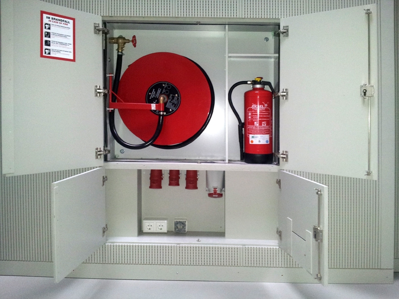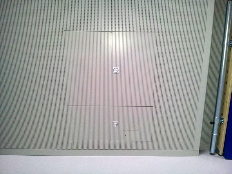 Zusätzlich müssen alle technischen Voraussetzungen wie ausreichende Stromzufuhr, Feuerlöscher, Löschschläuche, Brand- und Abzugsmelder sinnvoll in der Prallwand untergebracht werden ohne den Sportbetrieb zu behindern |